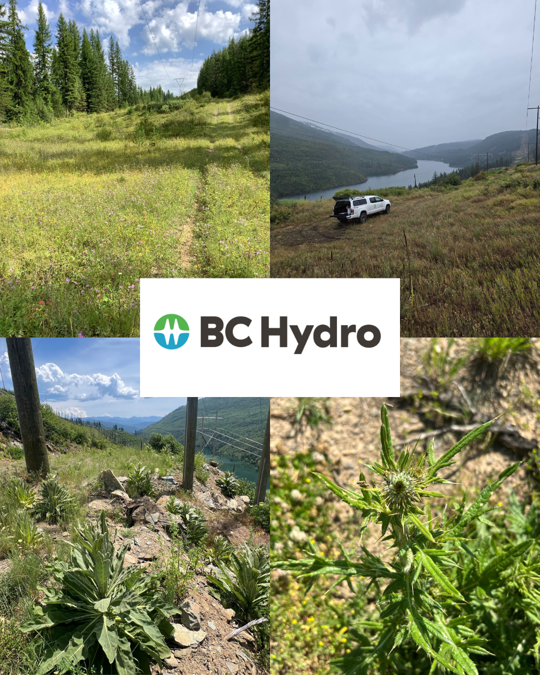 A huge thank you to BC Hydro for their support in 2025! This year we inventoried a big section of the BC Hydro transmission line corridor in the Pend D’Oreille Valley, which provided vital baseline info on what invasive species are currently growing on site. This ensures we can manage them accordingly and track our progress over the years. Another important subject of this year’s work was North Africa grass. We both mechanically and chemically controlled this aggressive species at multiple sites in the Pend d’Oreille Valley, ensuring native species are not outcompeted.